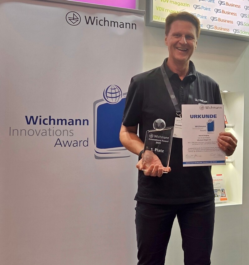 Das Unternehmen Vexcel Imaging überzeugte mit der UltraCam Dragon 4.2 sowohl die Experten- als auch die Publikumsjury. Das Produkt ist ein effizientes und vielseitiges hybrides Aerial-Mapping-System zur hochauflösenden Kartierung komplexer Umgebungen. Das System verfügt über 2 Nadir- (RGB und NIR) und 4 Oblique-RGB-Sensoren (je 19.136 × 12.736 Pixel) sowie einen 2,4-MHz-RIEGL-LiDAR-Scanner. Dessen neuartige Multi-Achsen-Scan-Geometrie, inklusive einer Nadir-Scanlinie, ermöglicht eine umfassende Erfassung selbst in engsten Straßenschluchten