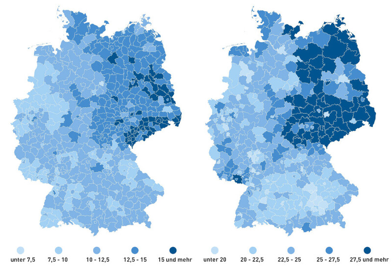 Dass die Bevölkerung in Ostdeutschland schneller altert als die im Westen, wird oftmals mit den Folgen der ökonomischen Unsicherheit nach der Wiedervereinigung in Verbindung gebracht. Die nach 1990 erfolgte Abwanderung junger Menschen in den Westen und ein Rückgang des Geburtenniveaus haben diese Entwicklung zweifellos verstärkt. Allerdings zeigt ein Blick auf die langfristige Perspektive des demografischen Wandels: Die räumlichen Unterschiede im Alterungsprozess in Deutschland reichen teilweise deutlich weiter zurück. Dies geht aus neuen Analysen eines Datensatzes des Bundesamts für Kartographie und Geodäsie (BKG) hervor, an denen das Bundesinstitut für Bevölkerungsforschung (BiB) mitgewirkt hat.